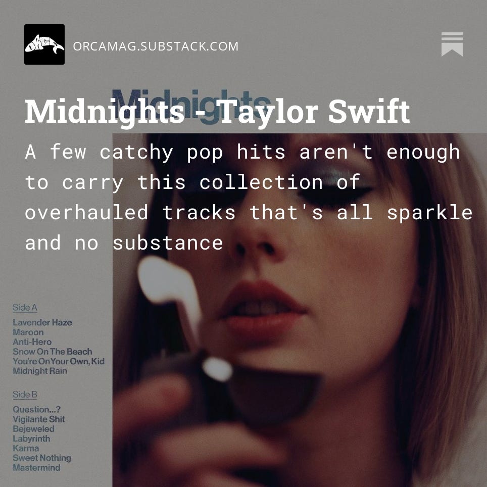 If you’re reading this that means I have at the very least intrigued you enough to click a few buttons, so I’ll consider that a win. This magazine has been a passion project of mine that I am SO stoked to finally share, so thank you for reading, truly. Over time, I hope to continue growing this magazine to include more variety in the kind of content you can expect, including album analyses, anecdotal pieces, and artist spotlights - but I’m getting ahead of myself. This inaugural issue collects several album reviews from some notable releases fromm last year as well as highlights from this year thus far.